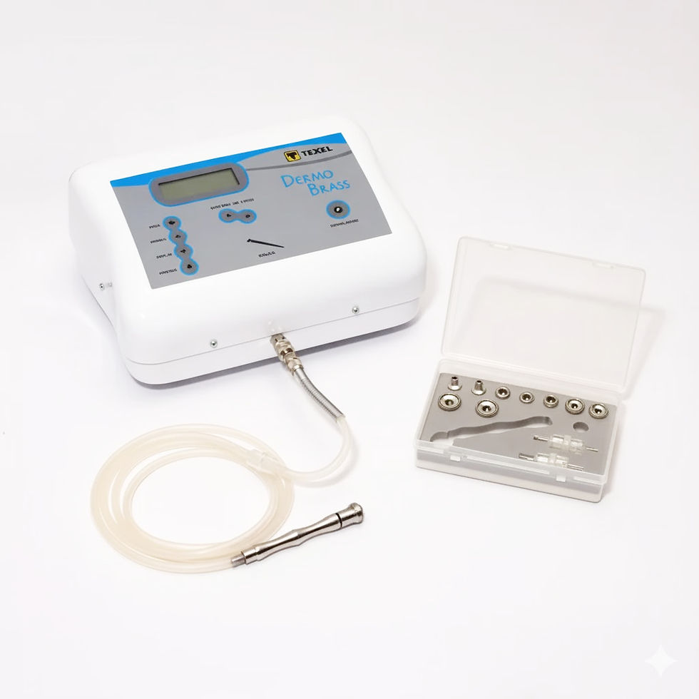 El Dermobrass con puntas de diamante es un equipo de peeling mecánico indoloro y no invasivo que realiza una exfoliación profunda succionando las células muertas de la capa más superficial de la piel estimulando la producción de colágeno. Cada punta es intercambiable y tiene diferentes granulometrías que permite hacer abrasiones a diferentes profundidades según la necesidad de la piel. El cabezal junto con la manguera es conectado al equipo generando succión, la cual permite la remoción de la capa cornea de la dermis por la adhesión del cabezal abrasivo a la superficie de la piel. La intensidad y profundidad de la abrasión va a depender de la succión y la presión que se ejerza con el cabezal sobre la piel. Al trabajar con succión, permite la estimulación de microcirculación cutánea lo que favorece el aumento del grado de hidratación en la piel. Como consecuencia de esta técnica, se logra una piel sana, suave luminosa y uniforme